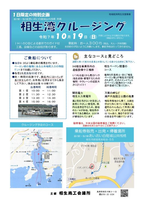 出港・帰着場所:道の駅・海の駅相生白龍城公共桟橋(兵庫県相生市那波南本町8-55)