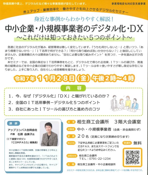 本セミナーでは、全国の身近なIT活用事例をもとに、デジタル化で得られる効果、ITツールの選び方、推進時の留意点などを中小企業の目線で分かりやすく解説します。ITツールは年々使いやすさが増し身近な存在になりました。上手に取り入れ、自社らしい成長戦略を描きましょう。